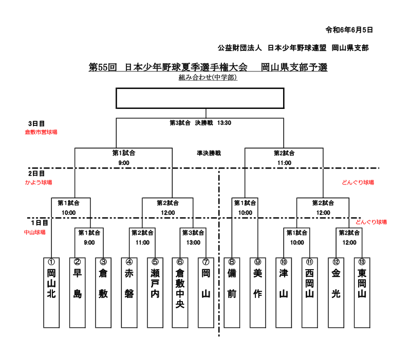 早島ボーイズ体験会開催 体験会開催!! 12/27(土) 山田グリーンパーク※12/28(日)深砂公園野球場両日とも13:00-16:30※チラシより場所変更していますのでご注意ください。 団員募集!! 早島ボーイズは活動日を土日・祝日として活動しています。新一年生、新二年生の体験練習を受付中です。是非一度お問合せください! 【近年の主なチーム戦績等】2024.5月第31回日本少年野球中四国春季大会出場 ベスト8 2024.12月岡山県中学硬式野球選手権大会(3リーグ大会)第3位2025.6月岡山県青少年育成県民会議顕彰事業 第44回中村賞 受賞 2025.6月TKYボーイズトーナメント2025第3位2025.11月令和7年度備中県民局環境保全功労者表彰 【お問合せ先】妹尾(マネージャー) 09041400506 青木(保護者代表) 09028610336上記ショートメールまたはインスタDMでも受け付けています。 【近年の高校進学先】(順不同) 倉敷工業、おかやま山陽、倉敷商業、翠松、岡山南 学芸館、岡山城東、倉敷青陵、金光学園、倉敷南、玉野商工、玉島商業、明誠学院、米子松蔭(鳥取) 【近年OBの甲子園出場】 2025.3月 9期生米子松蔭高校(鳥取)第97回選抜甲子園 2025.8月 10期生 岡山学芸館高校 第107回全国高等学校野球選手権大会 チーム活動予定は随時インスタグラムに掲載しています。